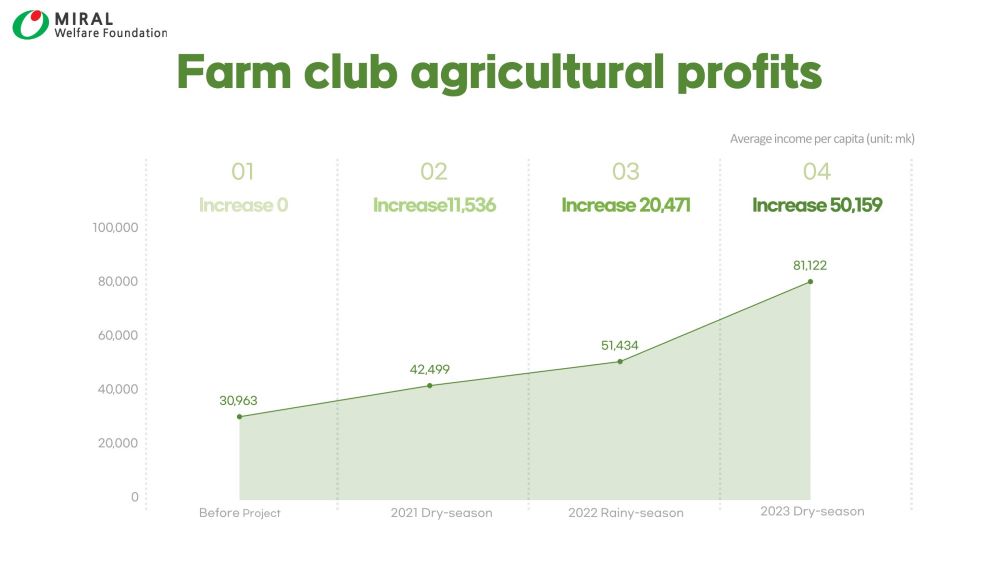 The Miral Welfare Foundation investigated agricultural profits before and after the project to observe changes in the lives of the farm club’s participants. Before participating in the farm, the annual agricultural profit per person was 30,963mk. However, after engaging in the project, the income increased to 42,499mk for the first harvest of dry season farming in 2021, 51,434mk for rainy season farming in 2022, and 81,122mk for dry season farming in 2022. This is an increase of up to 162%. The 2023 rainy season agricultural harvest is still being stored in granaries to be sold at better prices, with high profits expected.